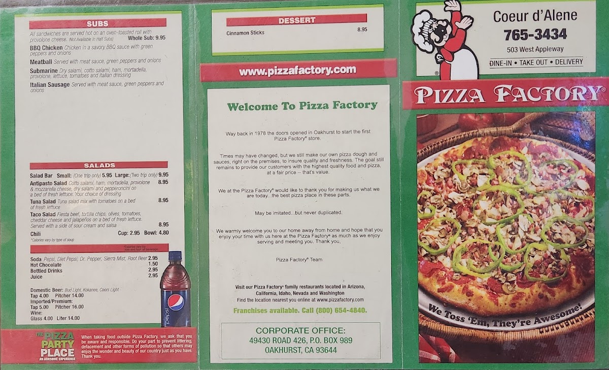 Welcome to Pizza Factory, the heart of indulgence for pizza lovers in Coeur d'Alene, Idaho. This family-owned restaurant offers a diverse menu that caters to everyone, from meat enthusiasts to veggie aficionados. Their signature All Meat Pizza satisfies hearty appetites with layers of pepperoni, bacon, and sausage, while the Veggie Pizza delights those seeking a lighter option.